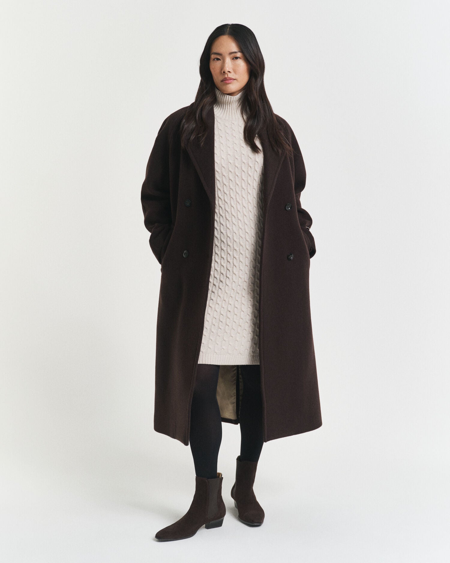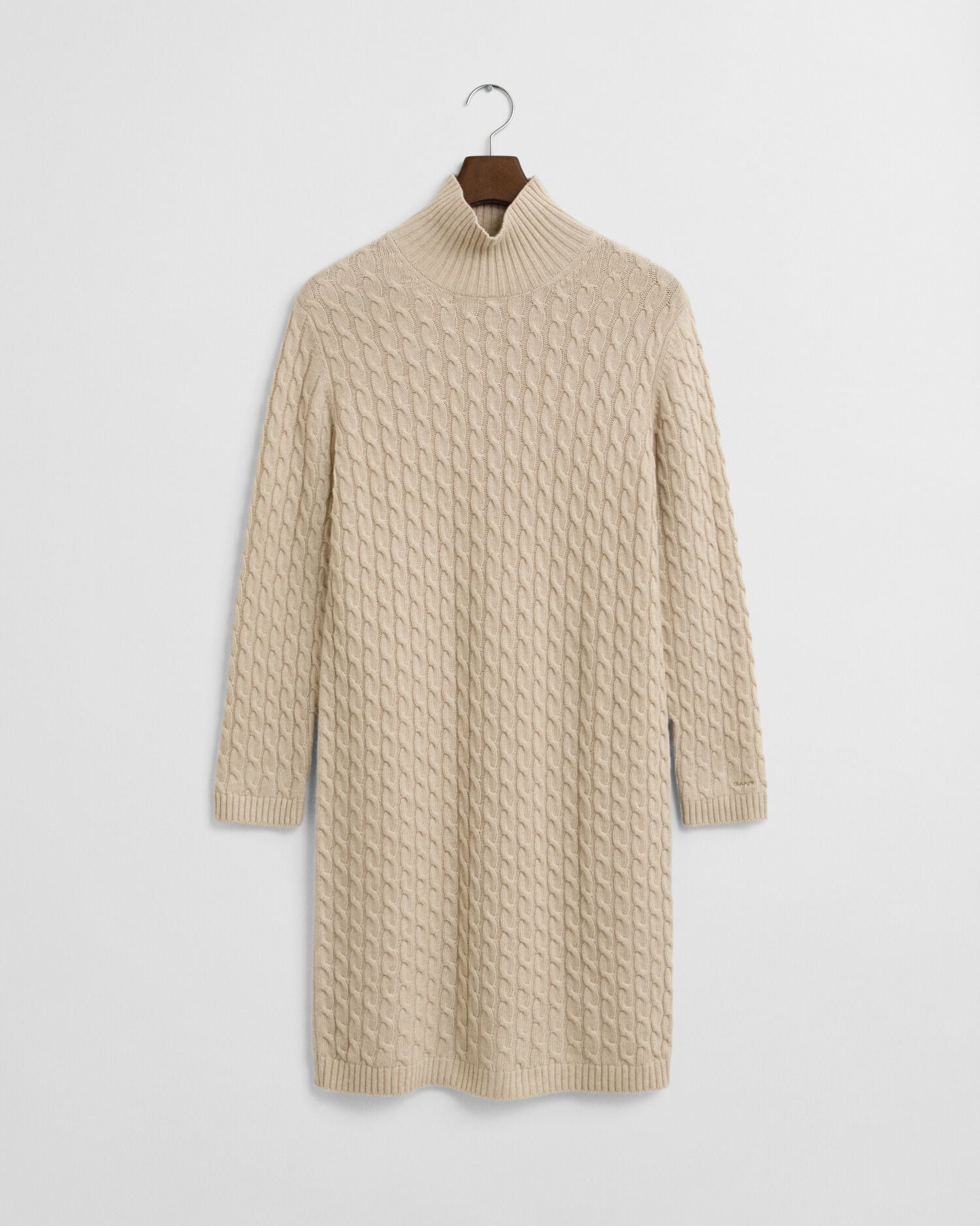 Made from a soft, premium blend of wool, viscose and cashmere, this dress is an essential for the colder seasons. Cut for a relaxed fit and finishing right below the knees, it features a classic turtleneck, an all-over cable knit pattern and ribbed detailing at the neck, hem and sleeve cuffs. This garment is intended for a relaxed fit. For a closer fit, we recommend sizing down.