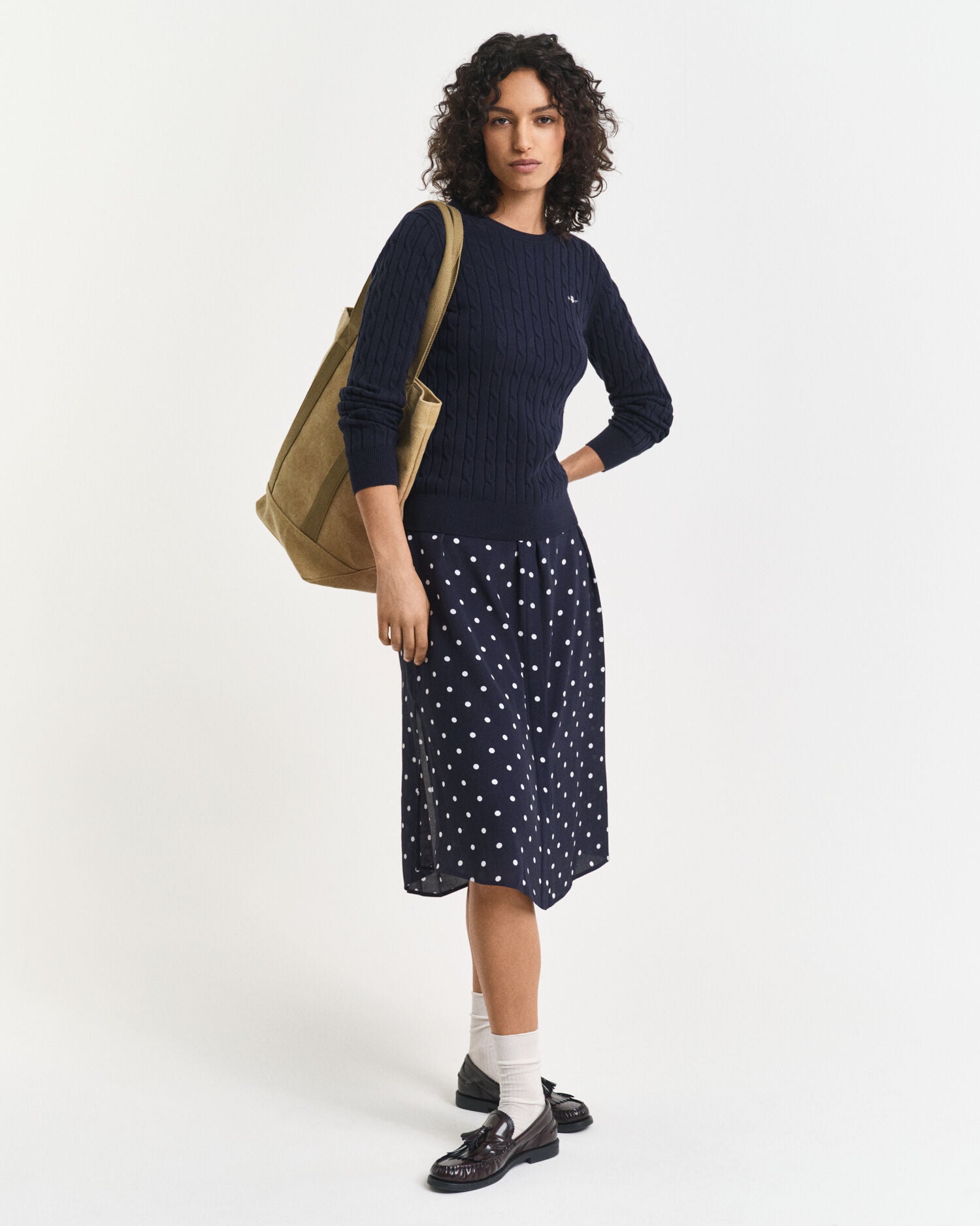 An American sportswear classic, the cable knit sweater has roots with the Aran Islands and Irish fisherman, but has been adored by everyone from Hollywood film stars to boarding school students around the world. Crafted from a soft cotton elastane blend for a slim yet stretchy fit, our version keeps it crisp and versatile with ribbed details, a classic crew neck, and our signature shield graphic embroidered at the chest. Plus, in a range of neutrals and vibrant seasonal hues, you can justify one in every color.